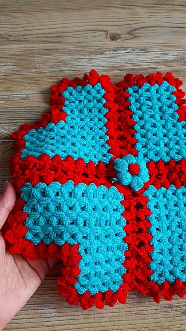 Kırmızı ve mavi renklerde, çiçek detaylı, yumuşak dokulu renkli örgü banyo süngeri. el emeği marka temsili