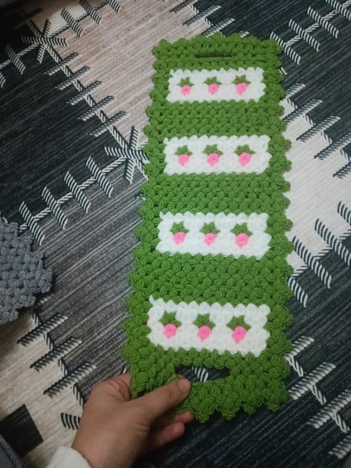 Bu renkli banyo süngeri, yeşil, beyaz ve pembe detaylarla el yapımıdır. Yumuşak ve dokulu yapısıyla kullanışlıdır.