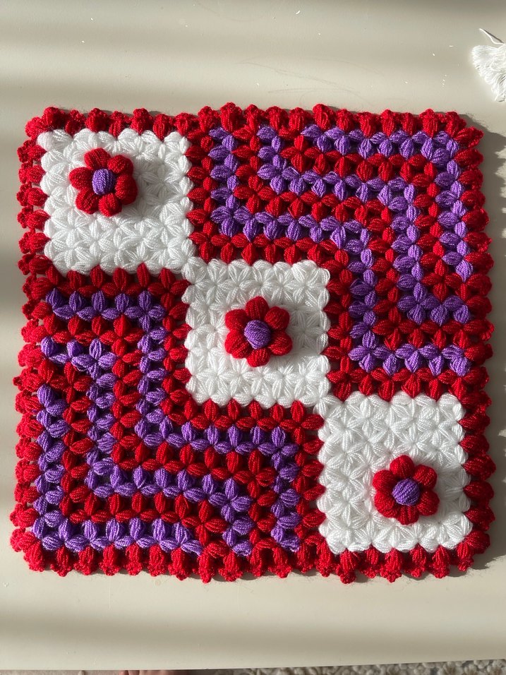 Kırmızı, mor ve beyaz renklerde, küçük çiçek detaylarıyla el örgüsü şeklinde renkli bir banyo süngeridir. Canlı ve farklı bir doku sunar.
