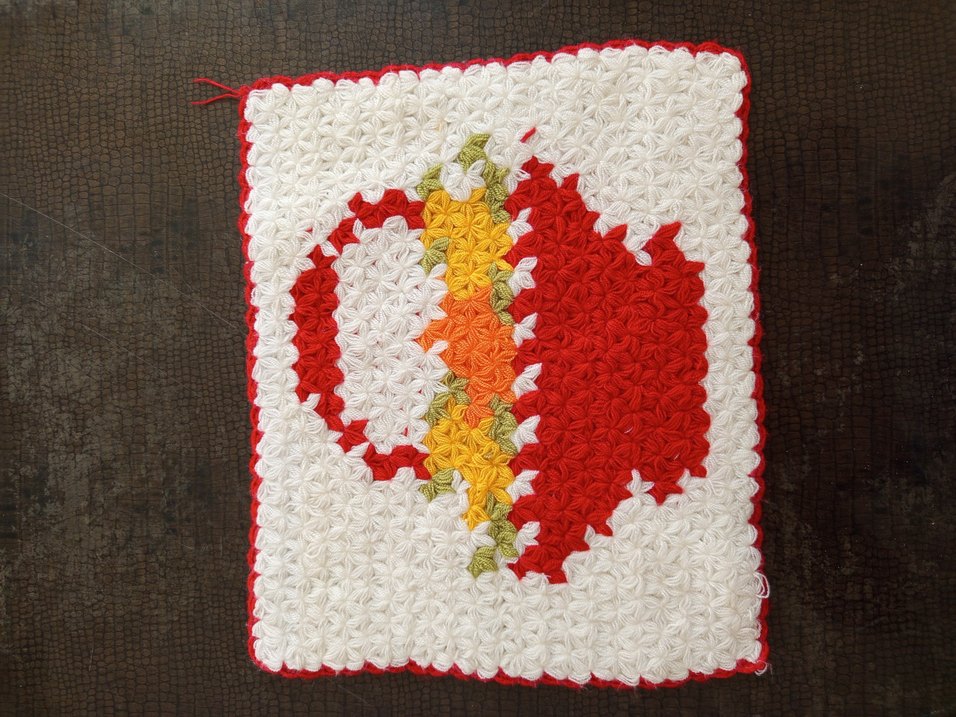 Kırmızı, beyaz, turuncu ve sarı tonlarda dokulu örgü tasarımlı renkli banyo süngeri.