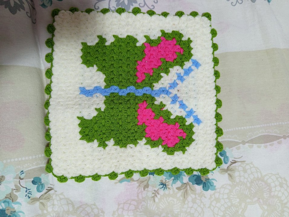Yeşil, pembe, mavi ve beyaz iplerden örülmüş desenli, renkli örgü banyo süngeri.