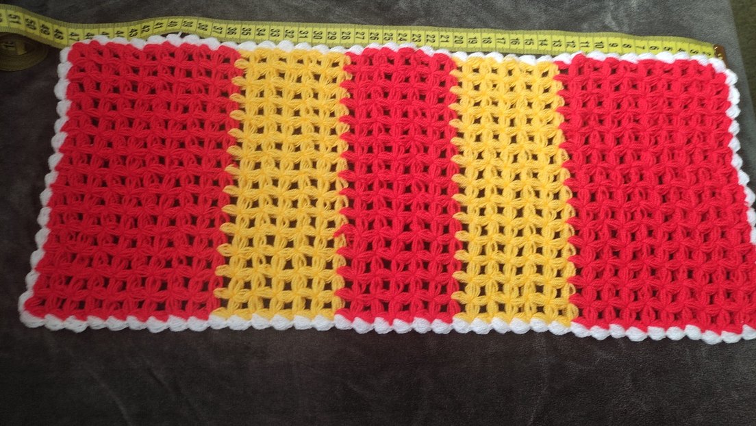Sarı, kırmızı ve beyaz renklerde çizgili, yumuşak dokulu renkli örgü banyo lifi