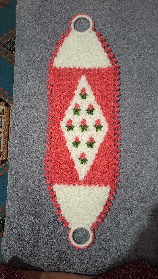 Kırmızı, beyaz ve yeşil renklerin harmanlandığı el örgüsü banyo süngeri, iki ucunda asma halkaları bulunur.