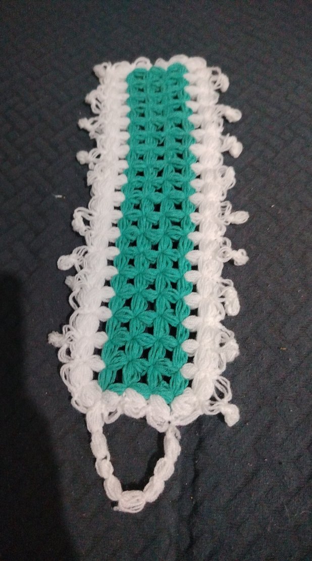 Yeşil ve beyaz iplikten yapılmış, asma halkalı renkli örgü banyo süngeri.