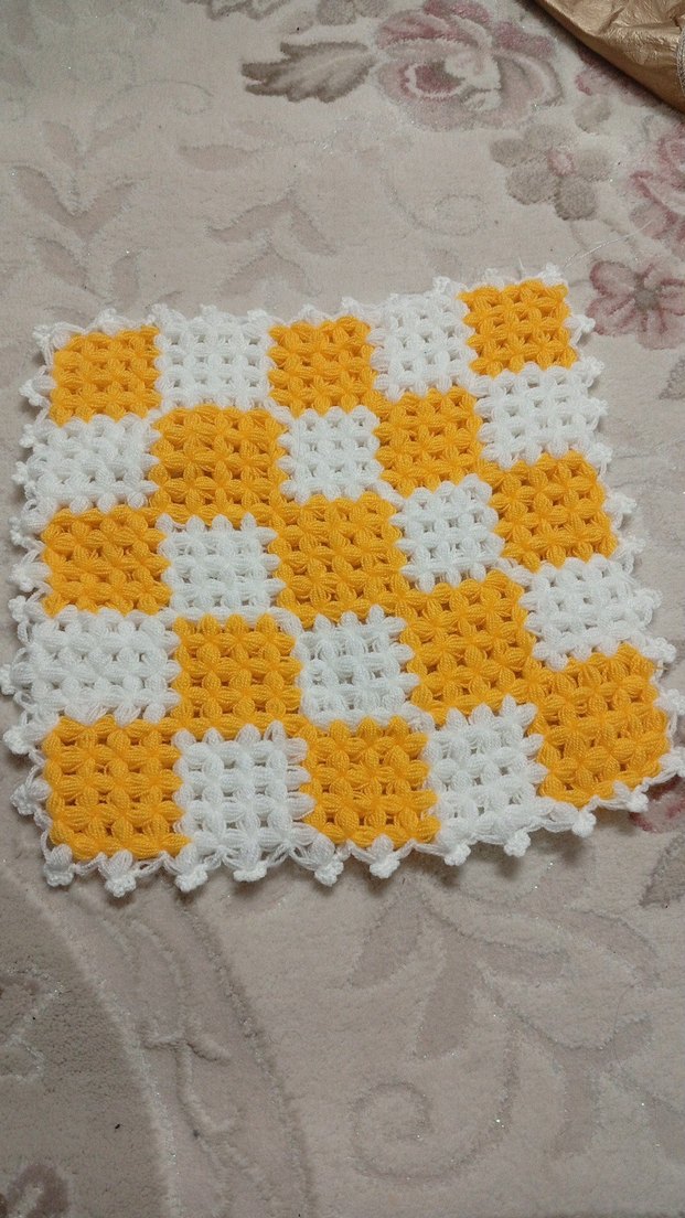 Sarı ve beyaz kare desenli, yumuşak dokulu renkli örgü banyo süngeri.