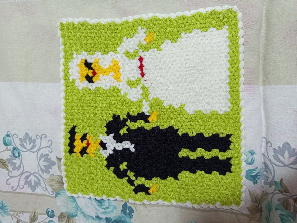 Canlı renklerde, yeşil zemin üzerinde kontrast desenli örgü banyo süngeri.