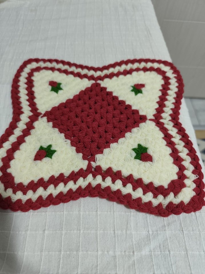 Kırmızı, beyaz ve yeşil renklerde çiçek detaylı, yıldız şekilli renkli örgü banyo süngeri.