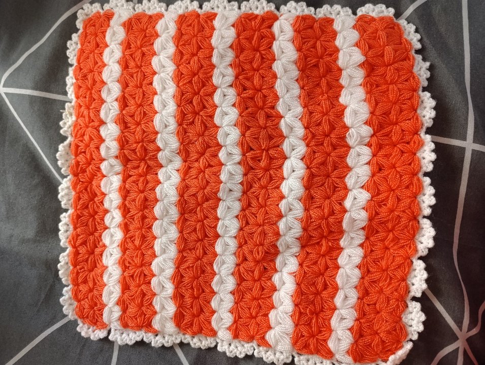 Turuncu ve beyaz çizgili, dokulu desenli renkli örgü banyo süngeri.