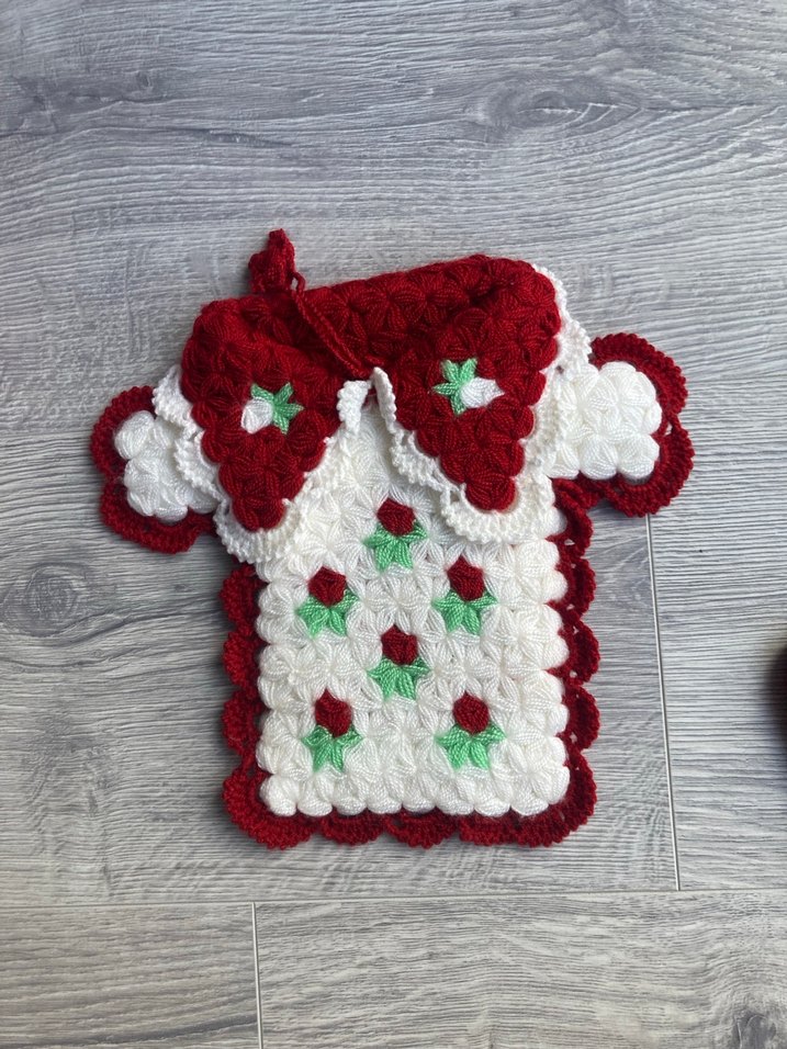 Kırmızı, beyaz ve yeşil renklerde dokuma desenli, askı halkalı renkli örgü banyo süngeri. Yeni