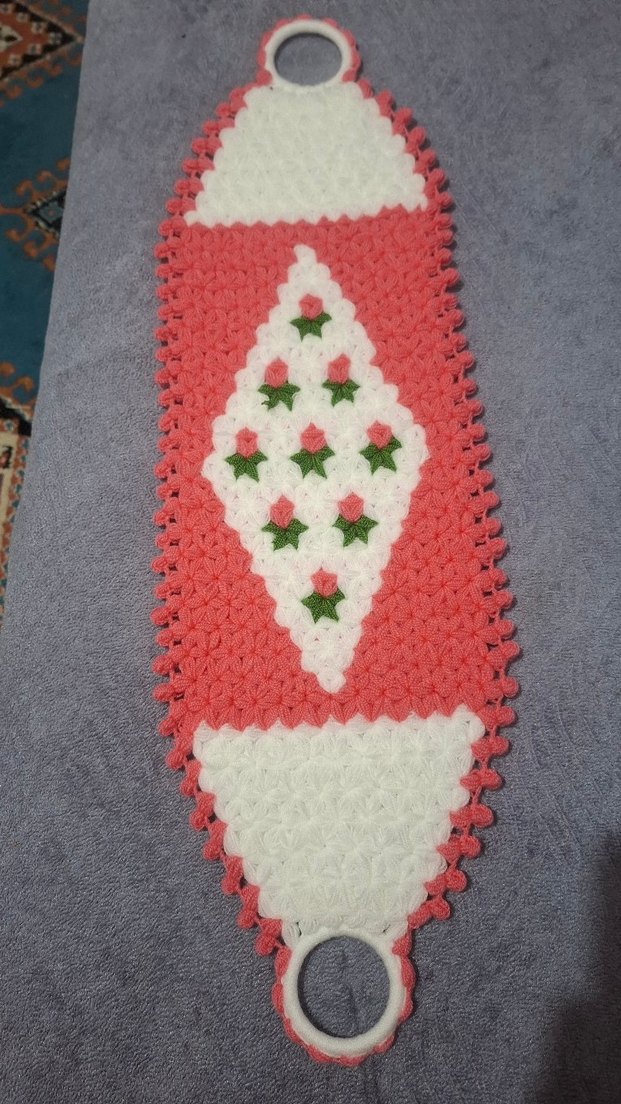 Beyaz, pembe ve yeşil renklerde el örgüsü renkli banyo süngeri. Asma halkası bulunur.