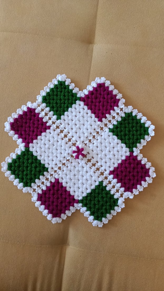 Beyaz, yeşil ve mor karelerden oluşan el örgüsü renkli banyo süngeri, farklı bir doku sunar.
