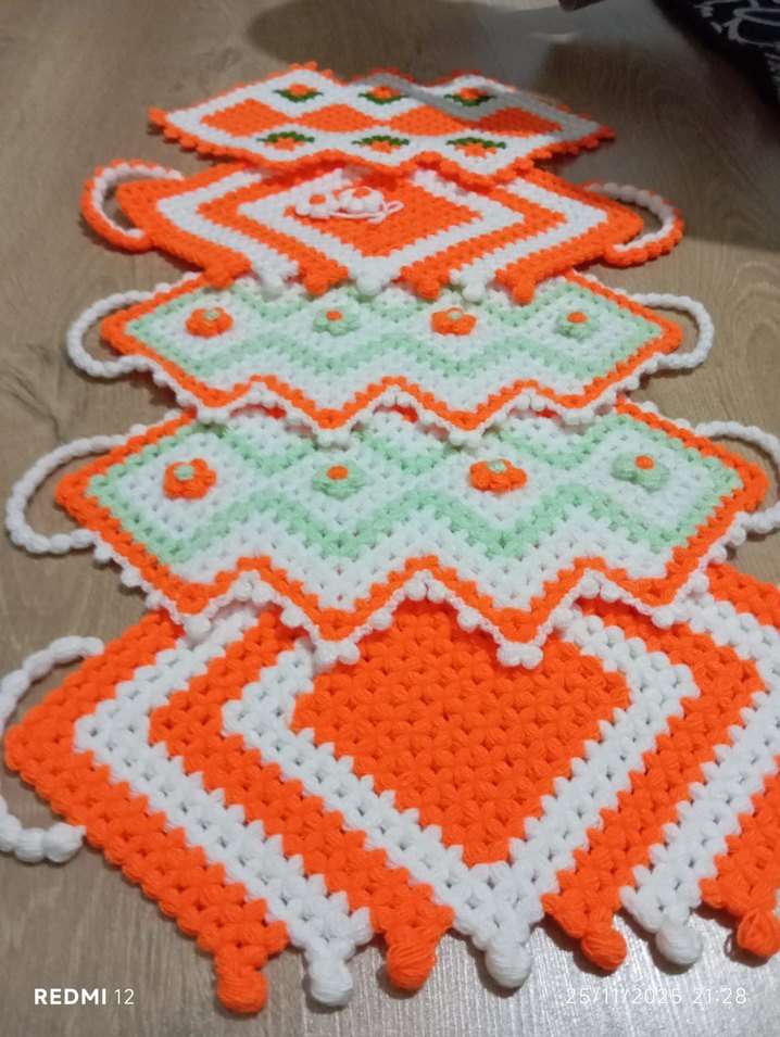 Turuncu, beyaz ve yeşil tonlarda geometrik desenli renkli örgü banyo süngeri. istenilen renk ölçü ve sayıda yapılır