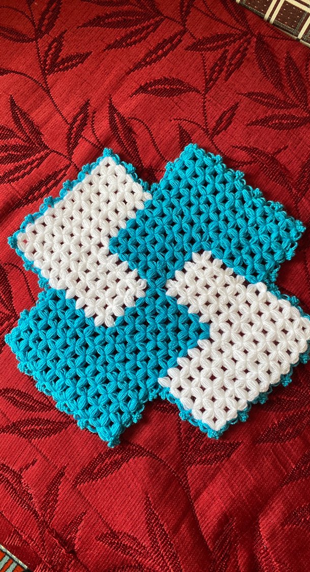 Canlı mavi ve beyaz renklerde, dokulu örgü desenli renkli banyo süngerleri seti.