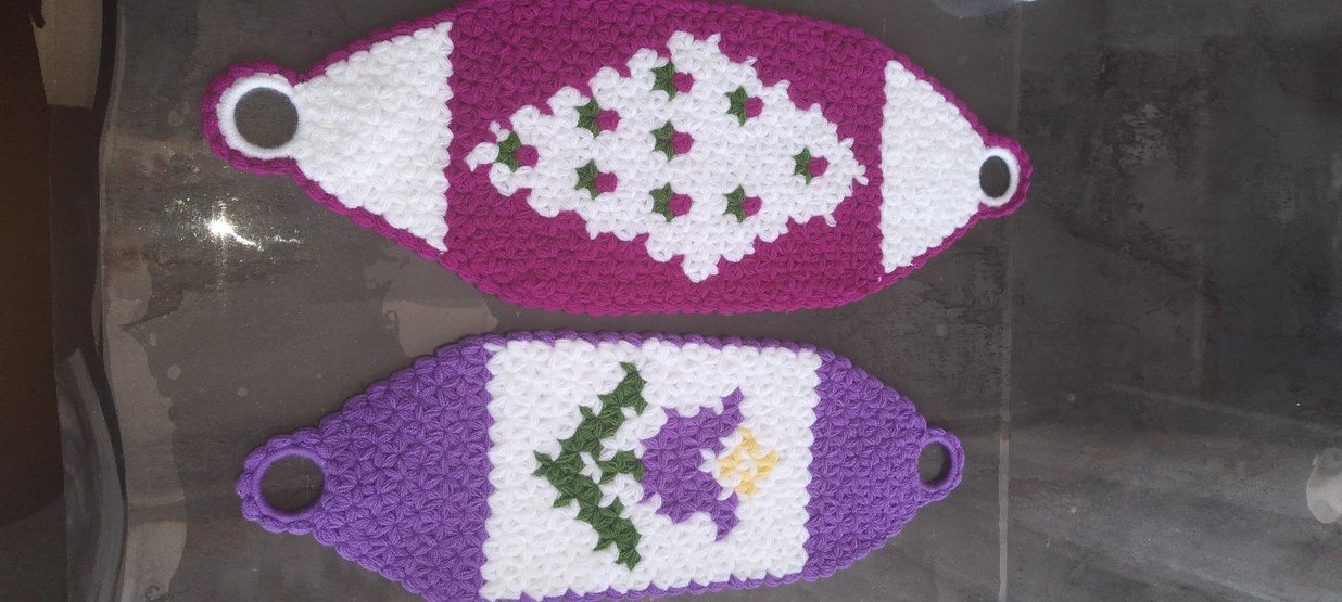 Beyaz, yeşil, mor ve sarı renklerde el örgüsü desenli, renkli banyo süngerleri. Yumuşak ve dekoratif.