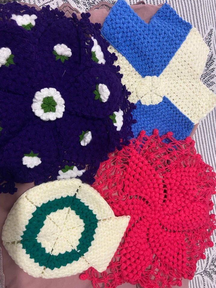 Farklı şekillerde ve canlı renklerde, nazikçe peeling yapmaya uygun renkli örgü banyo süngerleri seti.