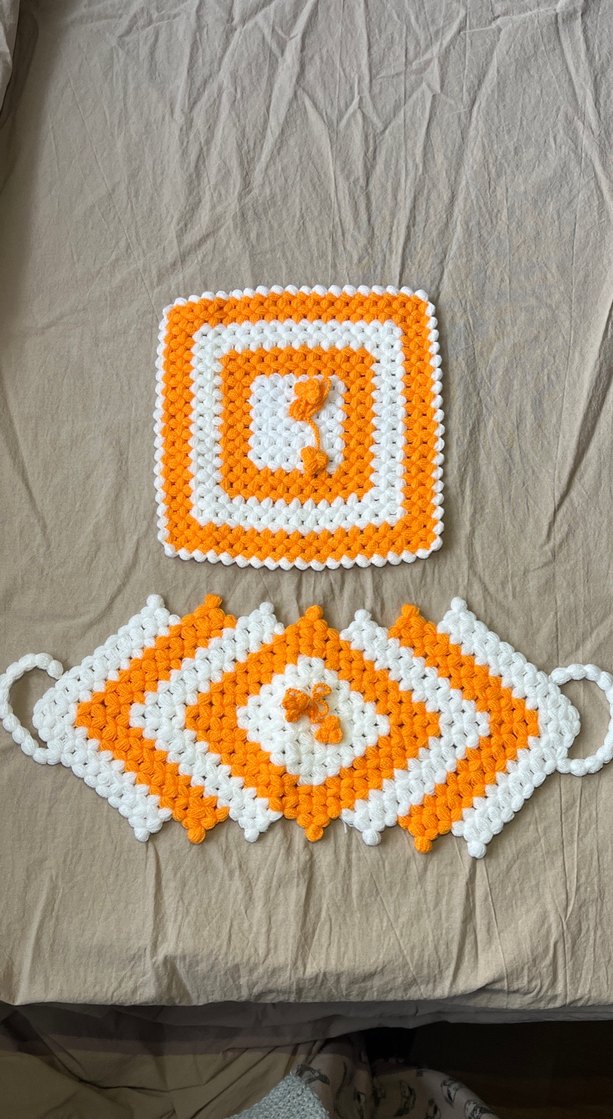 Turuncu ve beyaz renklerde, kare ve elmas şekilli örgü banyo süngerleri, kolay kullanım için kulplu.