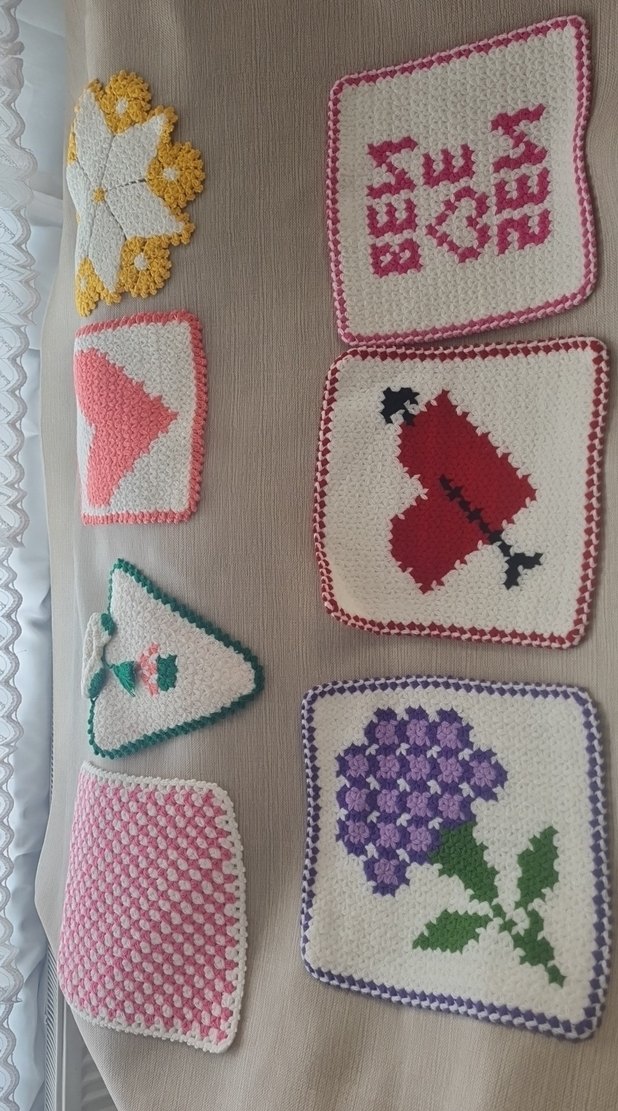 Çeşitli desenlere sahip, renkli ve el örgüsü banyo süngerleri seti. Her sünger farklı tasarıma ve canlı açık renklere sahiptir.