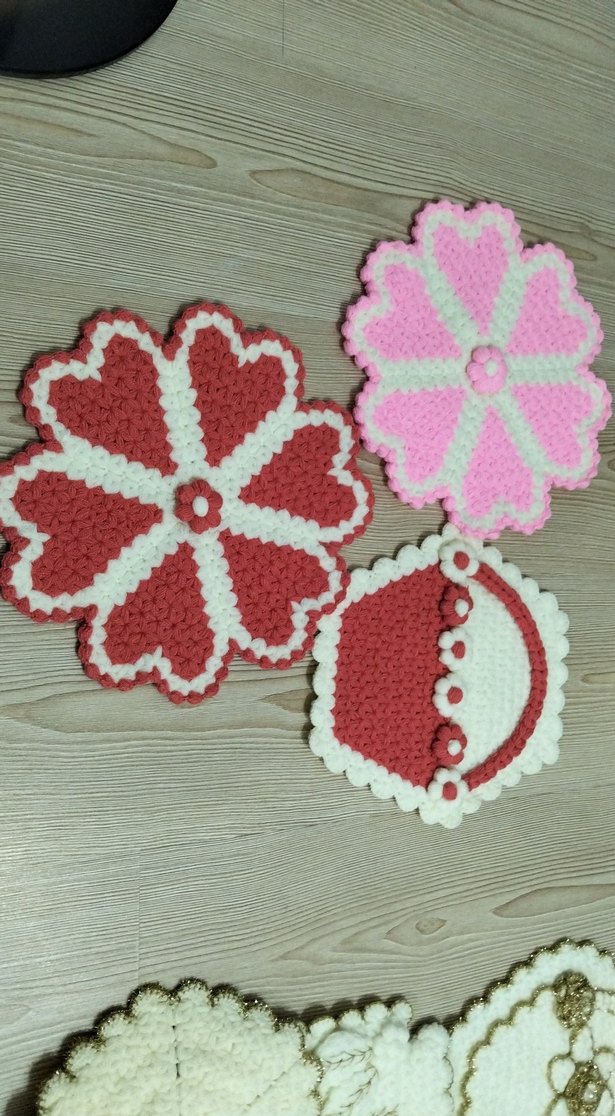 Çiçek şeklinde, yumuşak dokulu, renkli örgü banyo süngerleri seti.