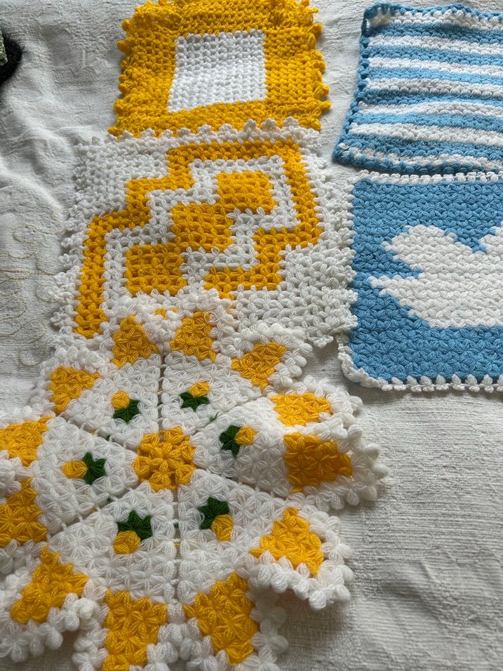 Sarı, beyaz, mavi ve yeşil detaylara sahip renkli örgü banyo süngerleri. Yumuşak ve dekoratif, banyo için uygundur. Adet fiyatıdır