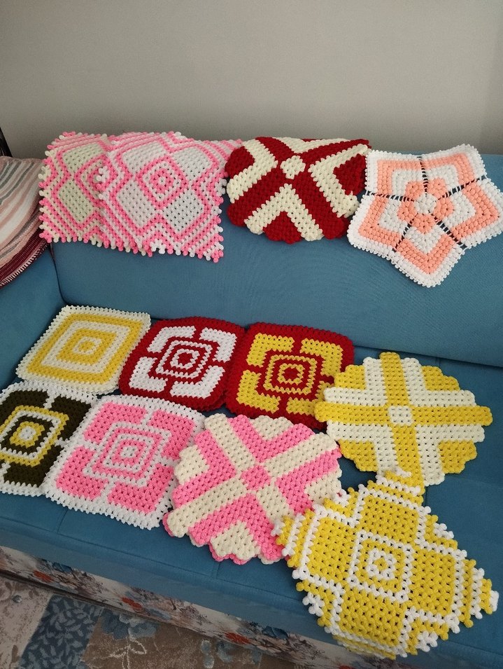 Çeşitli geometrik desenlere sahip renkli örgü banyo süngerleri, nazik temizlik ve dekoratif kullanım için uygundur.