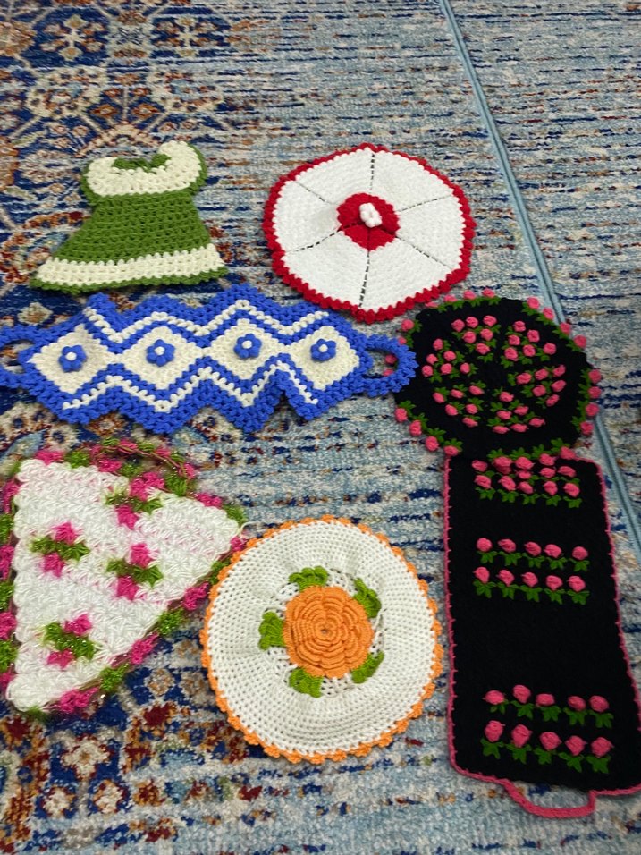 Çiçekli ve geometrik desenli, çeşitli şekillerde renkli örgü banyo süngerleri.