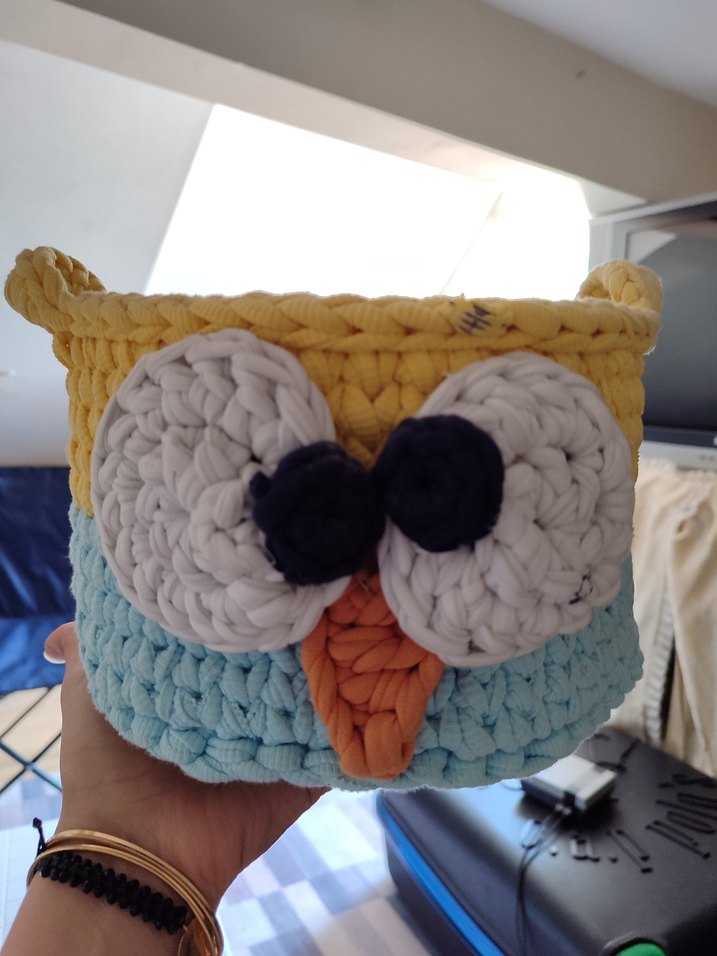 Renkli örgüden yapılmış, baykuş desenli yumuşak dokulu sepet. Depolama ve dekorasyon için uygundur. bebek bezi ıslak mendil küçük oyuncak için de uygundur