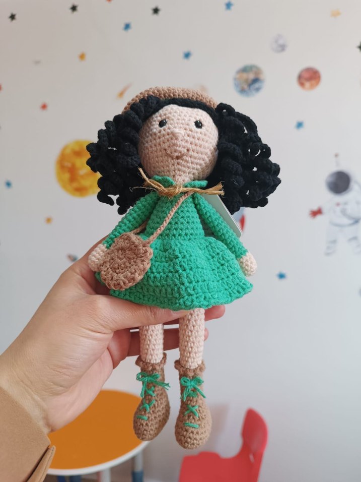 Renkli örgü bebek, siyah kıvırcık saç, yeşil elbise ve kahverengi şapka, çanta ile botlara sahiptir.
