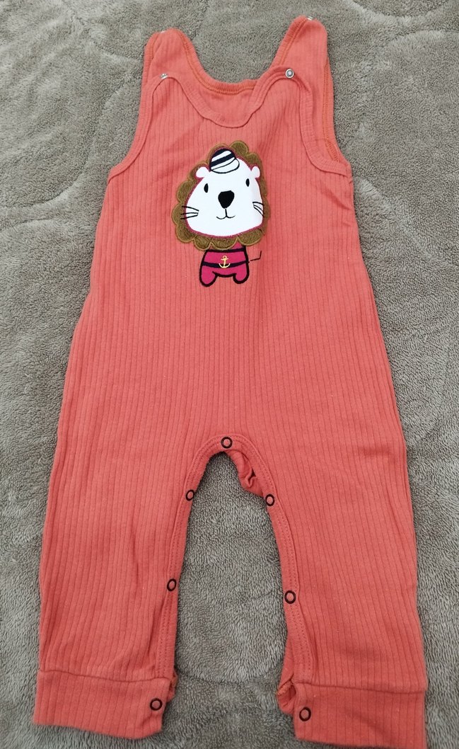 Renkli örgü kumaştan yapılmış, önünde sevimli aslan figürü bulunan bebek kız tulumu. Alt kısmında kolay bez değiştirme için çıtçıtlar bulunur.