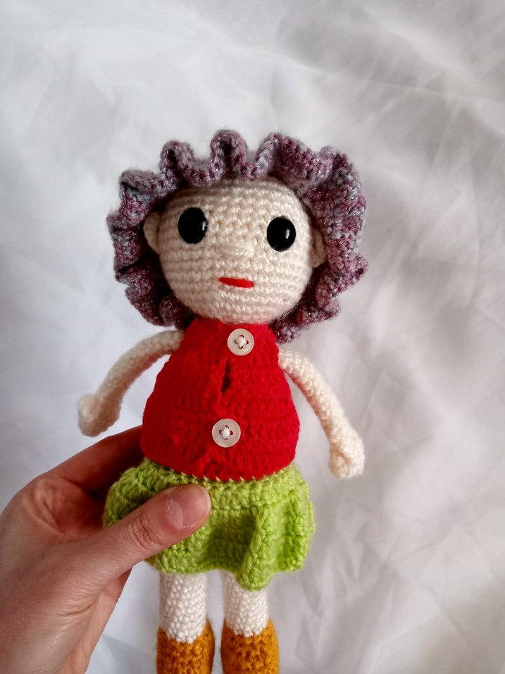 El yapımı, renkli örgü bebek; kırmızı üst, yeşil etek ve mor saç detaylarıyla yumuşak tasarım.
