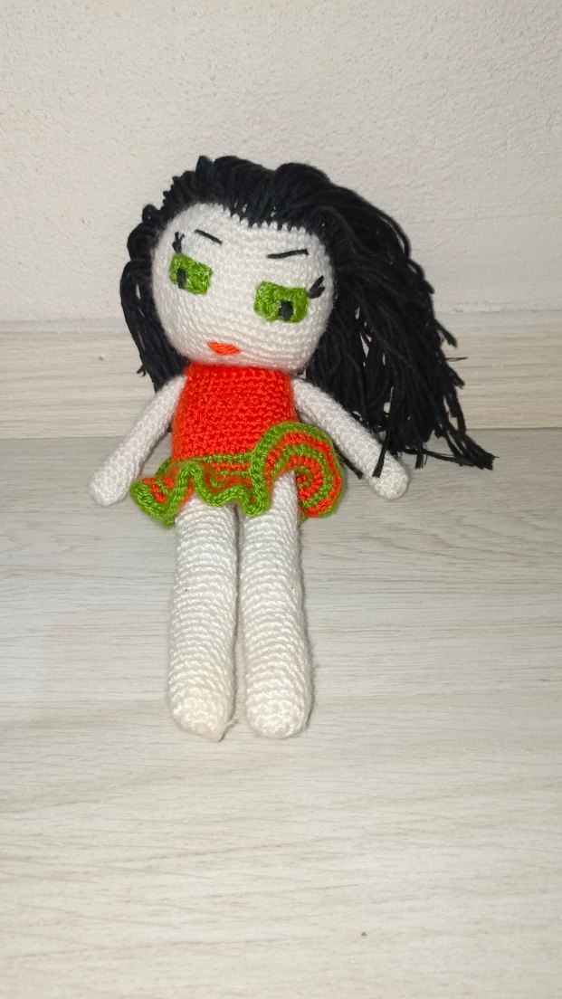 Siyah saçlı, yeşil gözlü, kırmızı ve yeşil elbiseli renkli örgü bebek. Yumuşak ve detaylı tasarım.