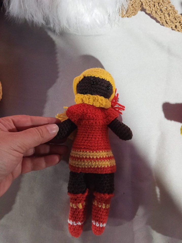 Renkli örgüden yapılmış, sarı başörtülü ve çizgili kırmızı elbiseli oyuncak bebek.
