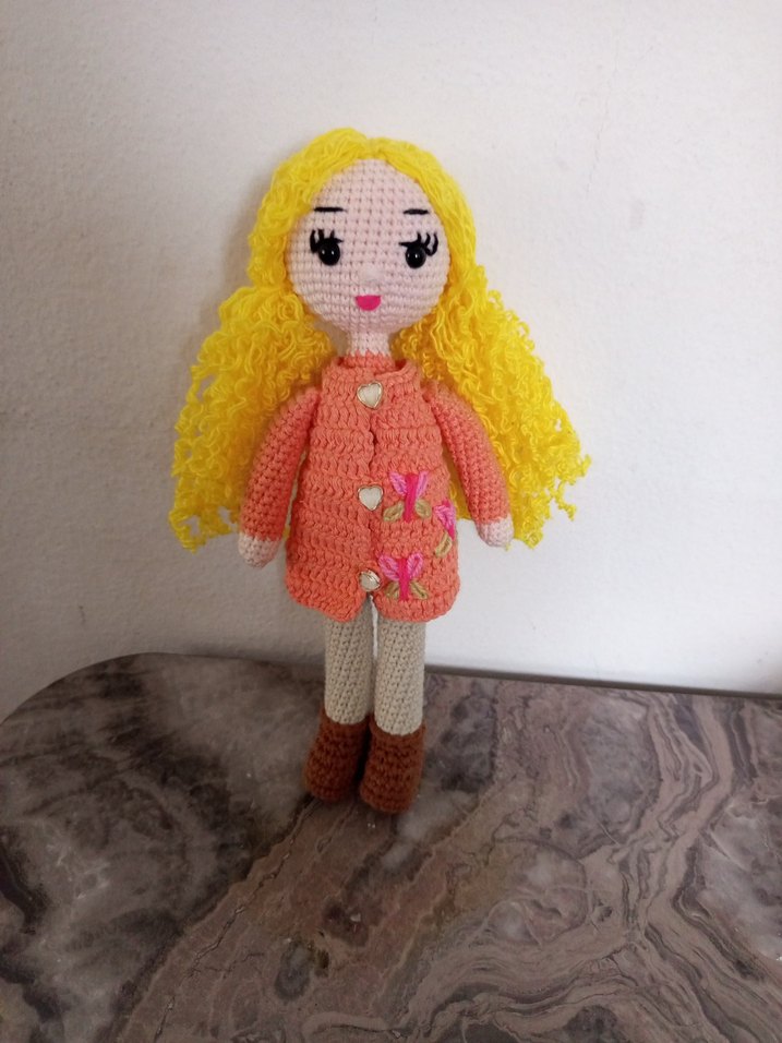 Uzun sarı saçlı, bej tenli, süslemeli şeftali renkli kıyafetli renkli örgü bebek. Yumuşak ve el yapımı. Bebek tek parça örülmüştür boyu 28 cm yeni örüldü görseli satın alabilirsiniz hemen kargolama yapılır koton ip kullanildi