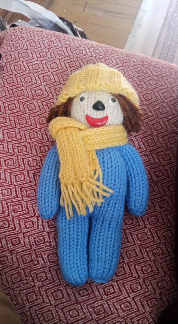 Sarı şapka ve atkı takan, mavi kıyafetli renkli örgü bebek. Gülümseyen yüzü ve kahverengi ipten saçları var.30 cm boyunda