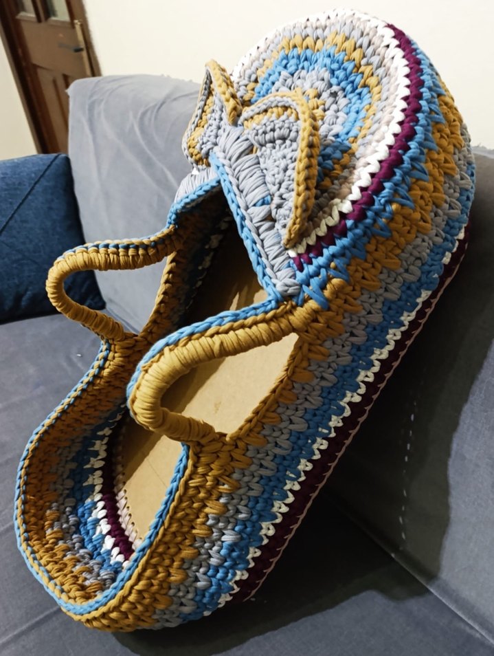 Renkli örgü bebek sepeti, kulplu ve sağlam yapıda, yumuşak dokulu bir üründür.