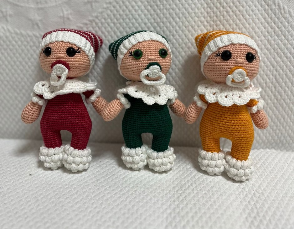 Şapka ve botlu, emzikli renkli örgü bebekler, el ele tutuşuyor. Yumuşak dokulu ve detaylı oyuncaklar.