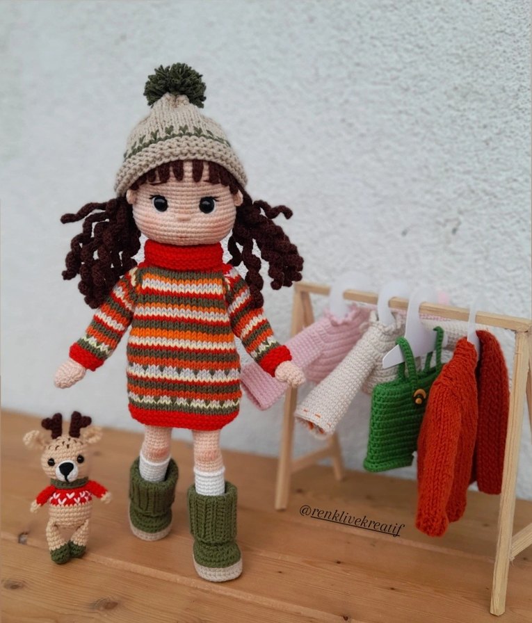 Çok renkli çizgili elbise, şapka ve bot giymiş örgü bebek, yanına ekstra örgü kıyafetler ve küçük geyik figürü eşlik ediyor. Botlar şapka çıkabiliyor. kollar hareketli