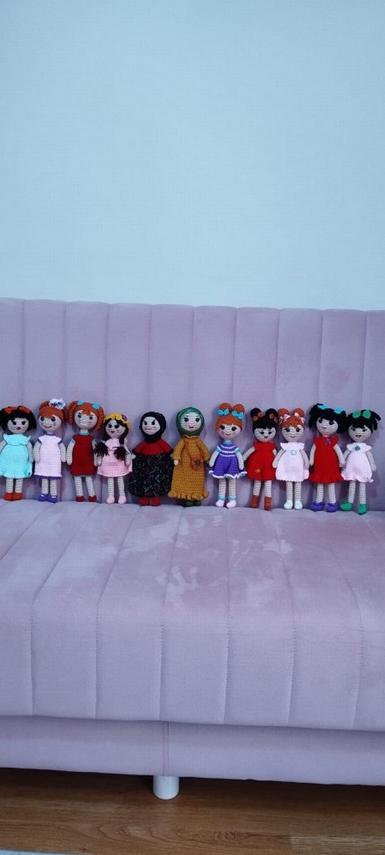Farklı kıyafet ve saç stillerine sahip çocuklarınızın çok seveceği renkli el örgüsü bebekler. Yaklaşık 23-24 cm boyutunda. Fiyat bir adet fiyatıdır.