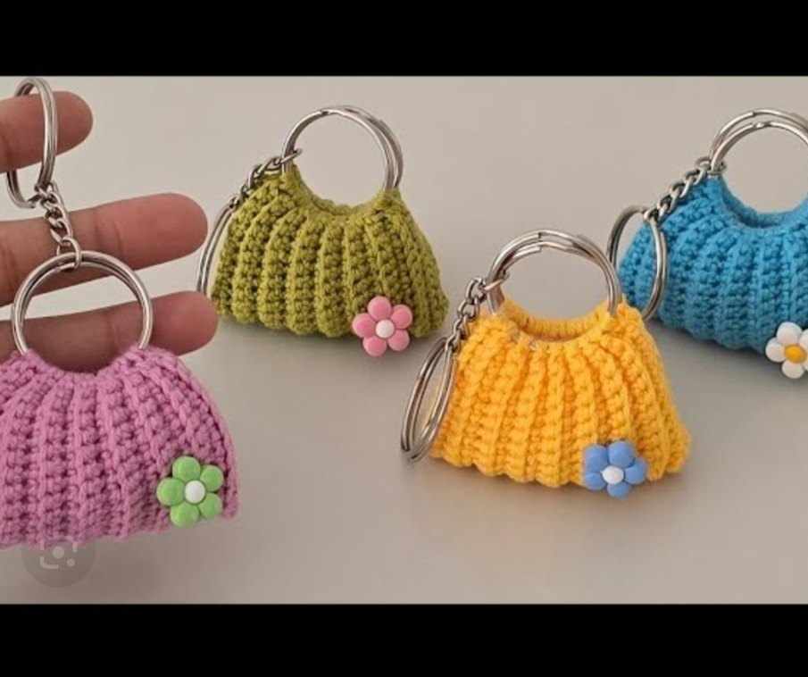 Renkli örgü anahtarlıklar, küçük çiçek detaylarıyla bohem ve rahat bir tarz sunar.