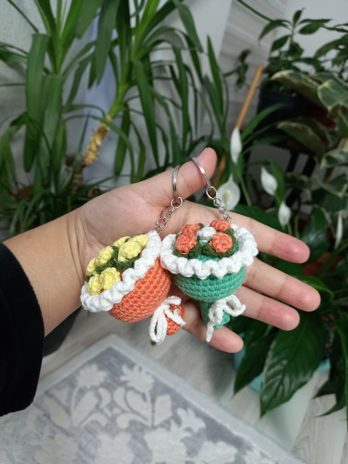 Yumuşak ipten, çiçek desenli, rahat bohem tarzı renkli örgü anahtarlıklar. Anahtarlarınıza retro bir dokunuş katmak için ideal.