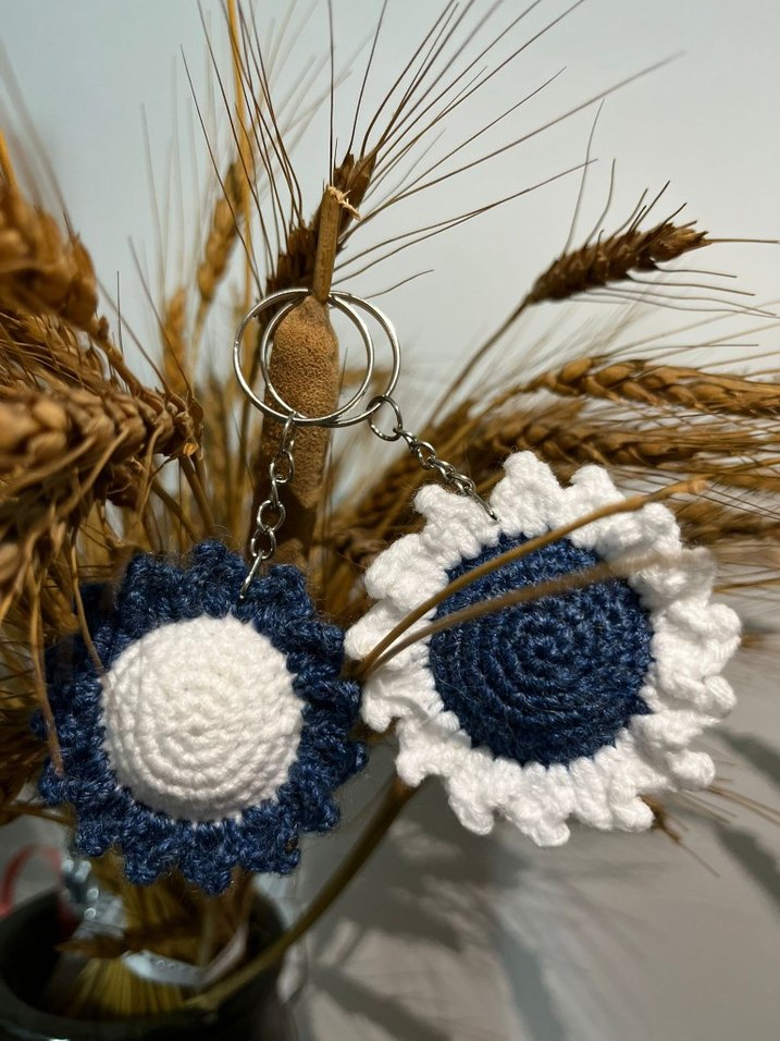 Renkli, örgü bohem tarzda anahtarlıklar. Mavi ve beyaz renkte, rahat ve retro bir görünüme sahip.