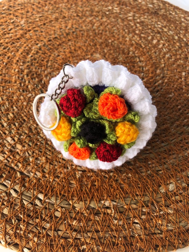 Renkli örgü anahtarlık, küçük çiçek desenleriyle bohem ve rahat bir stil sunar. Anahtarlarınıza retro bir dokunuş katmak için ideal.