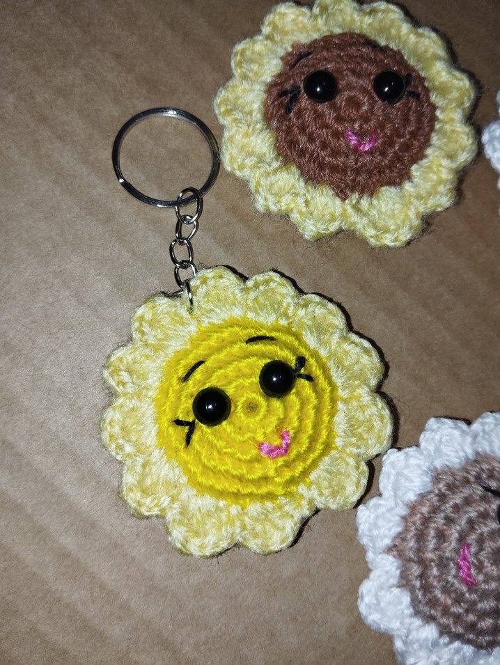 Renkli örgü, sarı ayçiçeği şeklinde bohem anahtarlık. Gülümseyen yüz ifadesi ile sıcak ve renkli tasarım.