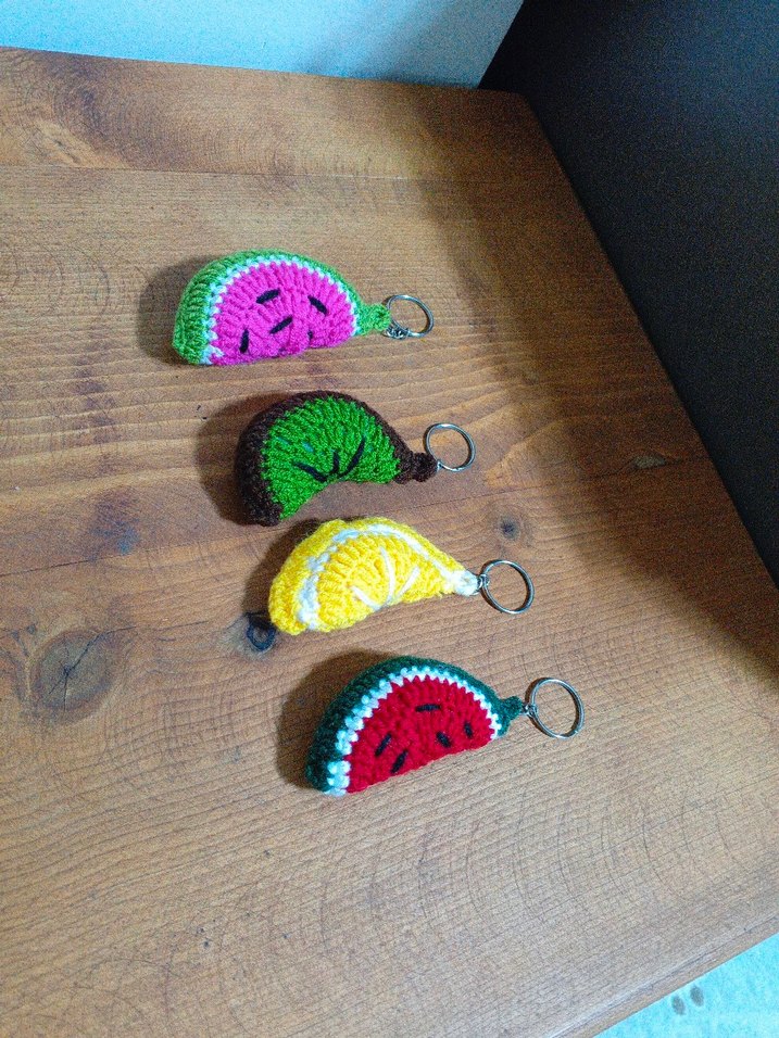 Renkli, meyve dilimi şeklinde örgü anahtarlıklar. Bohem ve retro tarzıyla, rahat bir görünüm sunar. Metal halka ile kolay kullanım sağlar. Adet fiyatıdır