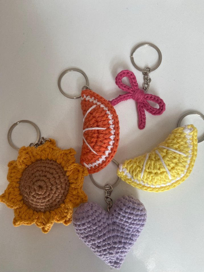 Bohem tarzda, örgü malzemeden yapılmış renkli ayçiçeği, narenciye dilimleri, fiyonk ve kalp şeklinde anahtarlıklar. Canlı ve rahat aksesuarlar. İstediğiniz renkte ve modelde örülür. Çanta charmı olarak da kullanabilirsiniz. Tane fiyatıdır.