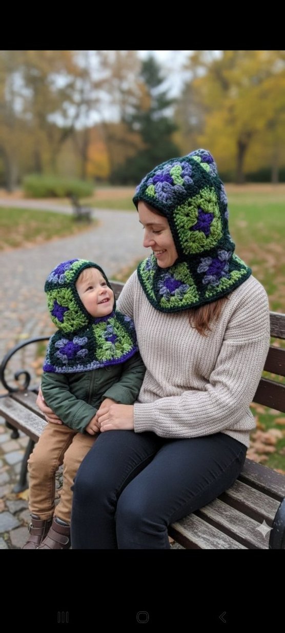 Koyu renkli çok renkli desenlerle örülmüş, rahat ve bohem tarzda bere. Hippie ve retro stiline uygun, serin havalar için ideal. balaklava bere anne çocuk olarak 2li tekki almak isterseniz profilimde mevcuttur tekli 1 yetişkin 1 de çocuk için vardır