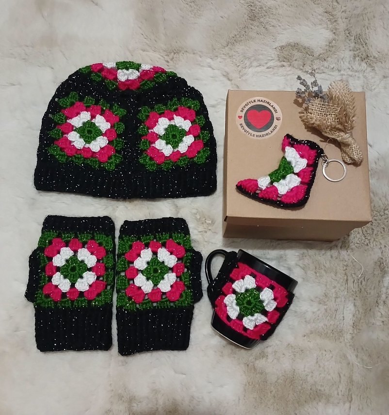 Renkli, çiçek desenli örgü kadın eldiven ve bere kupa bardak Yumuşak ve rahat, bohem ve retro tarzıyla uyumlu.#Bere #eldiven #şapka