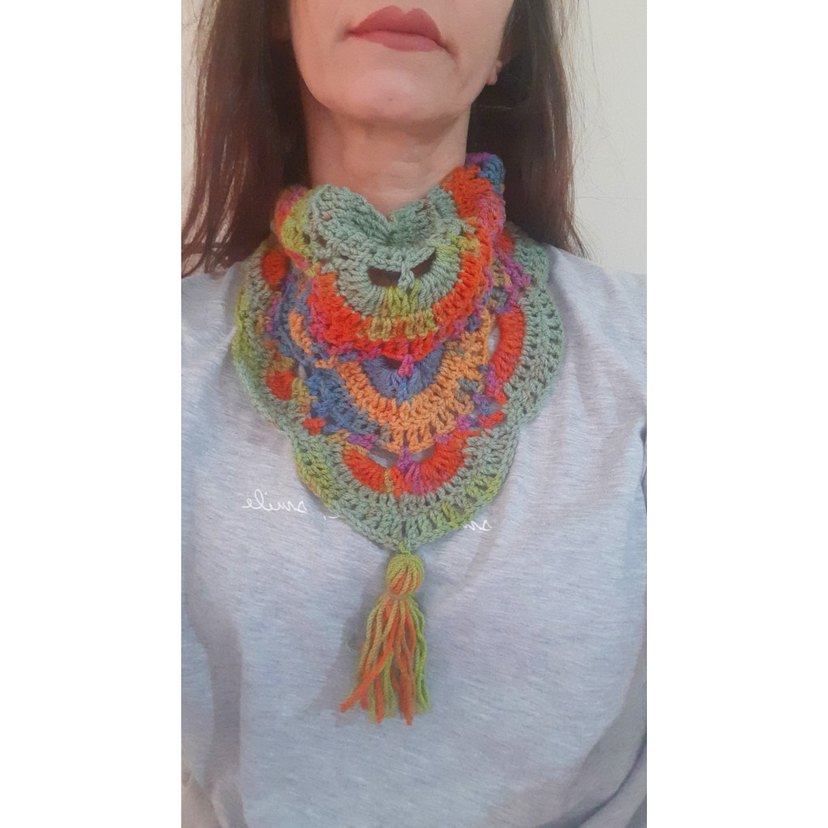 Bu kısa, örgü bohem boyunluk, çok renkli hafif batik desenli ve püskül detaylıdır, günlük kullanım için uygundur.