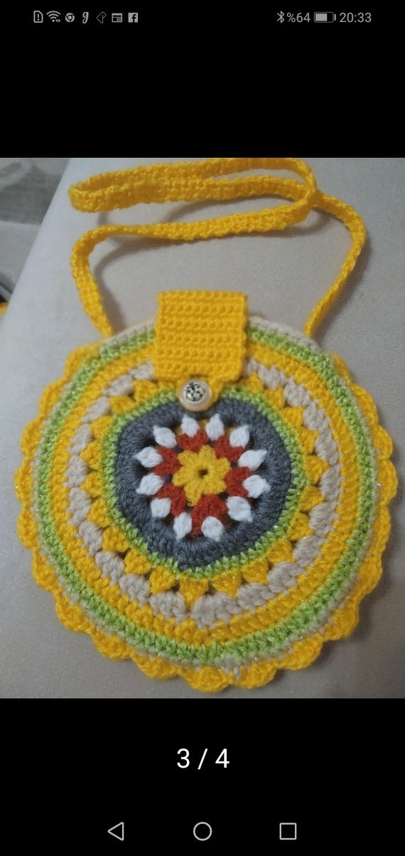 Renkli, örgü yuvarlak tasarımlı, nakış desenli ve düğmeli kapamalı bohem cocuk çantası, günlük kullanım için uygun.
