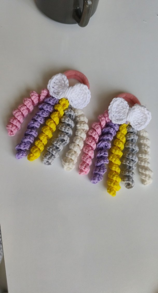 Bohem tarzda, örgüden yapılmış renkli, spiral desenli çocuk saç tokası. El yapımı