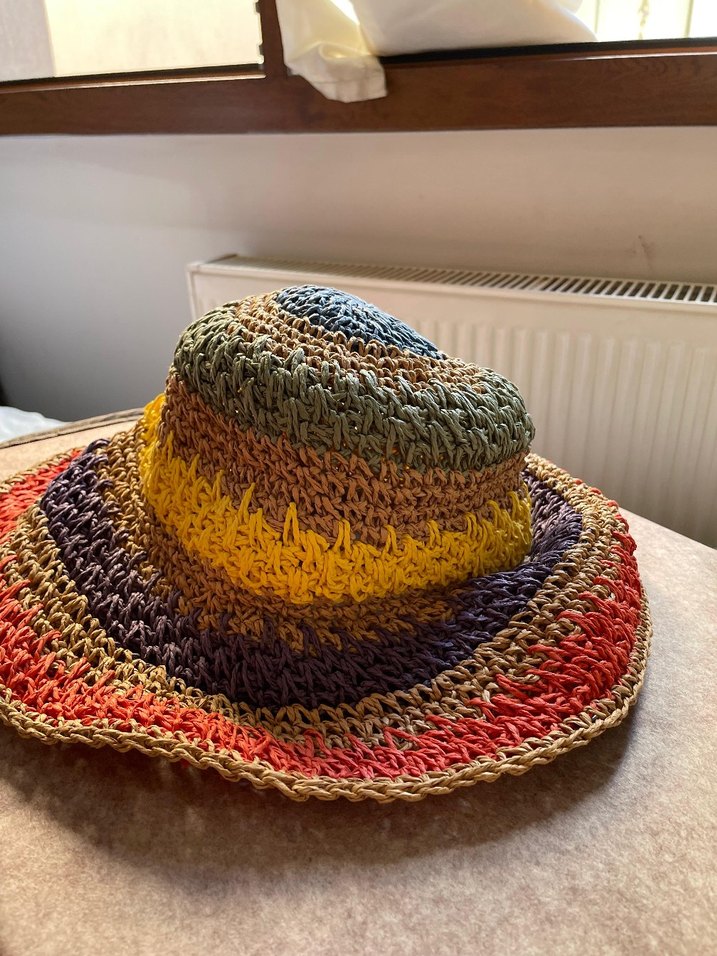 Yumuşak iplikten örülmüş, geniş kenarlı ve toprak tonlarında canlı çizgiler içeren renkli bohem yazlık hasır kadın şapkası.
